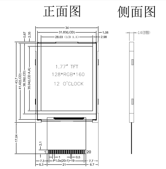 1. 结构轻、薄、带背光。 2. IC 采用ST7735S,功能强大,稳定性好 3. 指令功能强:例如可以用指令控制显示内容顺时针旋转90、逆时针旋转90°或倒立竖放。 4. 接口简单方便:采用8 位并行接口。 5. 工作温度宽:-20℃ - 70℃; 6. 储存温度宽:-30℃ - 80℃;